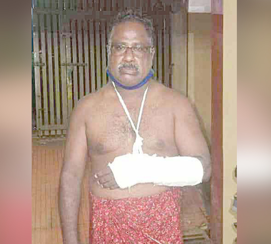 കൈ ഒടിഞ്ഞ അേദ്ദഹം അടൂർ ജനറൽ ആശുപത്രിയിൽ ചികിത്സയിലാണ്. താൽക്കാലികമായി പ്ലാസ്റ്റർ ഇട്ടെങ്കിലും കൈയുടെ സ്വാധീനം തിരിച്ചുകിട്ടണമെങ്കിൽ ഓപറേഷൻ നടത്തി കമ്പി ഇടണമെന്ന് ഡോക്ടർ പറഞ്ഞിരിക്കയാണ്.