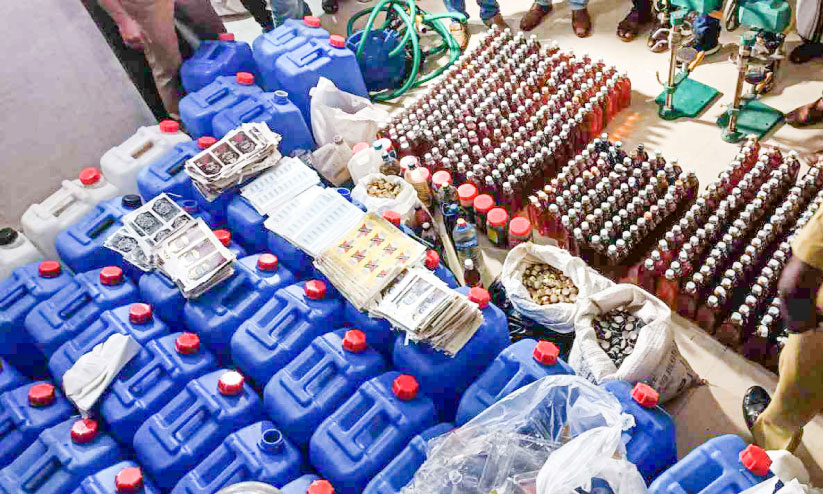 500 കുപ്പികളിലായി രണ്ട് പ്രമുഖ ബ്രാൻഡുകളുടെ പേരിലുള്ള 250 ലിറ്റർ കന്നാസുകൾ, പ്ലാസ്റ്റിക് ഡ്രമ്മുകൾ, മദ്യം കുപ്പിയിലാക്കി സീൽ ചെയ്യാൻ ഉപയോഗിച്ചിരുന്ന രണ്ട് യന്ത്രങ്ങൾ, കുപ്പിയിൽ പതിപ്പിക്കുന്ന ലേബലുകൾ, അടപ്പുകൾ, മദ്യം നിർമിക്കാൻ ഉപയോഗിക്കുന്ന എസൻസുകൾ, മറ്റ് അസംസ്കൃത വസ്തുക്കൾ എന്നിവയാണ് പിടിച്ചെടുത്തത്. യഥാർഥ മദ്യക്കുപ്പിയിലെ ലേബൽ പോലെ തന്നെ പ്രിന്റ് ചെയ്ത രണ്ടായിരത്തോളം ലേബലുകൾ ഉണ്ടായിരുന്നു. കുപ്പിയുടെ അടപ്പിനു മുകളിലെ ഹോളോഗ്രാം സ്റ്റിക്കർ ഉൾപ്പെടെ ഒറിജിനലിനെ വെല്ലുന്ന തരത്തിലാണ് നിർമിച്ചിരുന്നത്. ഒരു വർഷം മുമ്പ് വീടു വാടകക്കെടുത്താണ് നിർമാണവും വിൽപനയും ആരംഭിച്ചത്. ഇരുനില വീടിന്റെ താഴെയുള്ള മുറികളിലായിരുന്നു നിർമാണം. സ്റ്റേറ്റ് എക്സൈസ് എൻഫോഴ്സ്മെന്റ് സ്ക്വാഡ് മേധാവിയായ അസിസ്റ്റന്റ് എക്സൈസ് കമീഷണർ ടി. അനികുമാറിന്റെ നേതൃത്വത്തിലുള്ള സംഘമാണ് പരിശോധന നടത്തിയത്. വാവക്കാട് സ്വദേശി ജിന്റോയാണ് വീട് വാടകക്ക് എടുത്തതെന്ന് എക്സൈസ് പറഞ്ഞു. ഇയാളെ പിടികൂടിയിട്ടില്ല. എന്നാൽ, ഇയാളുടെ കുടുംബം ഇവിടെയല്ല താമസിക്കുന്നത്. ഒന്നര മാസമായി എക്സൈസ് സംഘത്തിന്റെ നിരീക്ഷണത്തിലായിരുന്നു വീടും പരിസരവും. വീട്ടിൽ രാത്രിയിൽ വെളിച്ചം കാണാറുണ്ടായിരുന്നെന്നും ചില വാഹനങ്ങൾ വന്നുപോകാറുണ്ടായിരുന്നെന്നും നാട്ടുകാർ പറഞ്ഞു. സിനിമ ഷൂട്ടിങ്ങുമായി ബന്ധപ്പെട്ടവരാണെന്നാണ് നാട്ടുകാരോട് ഈ വീട്ടിലുണ്ടായിരുന്നവർ പറഞ്ഞിരുന്നത്.