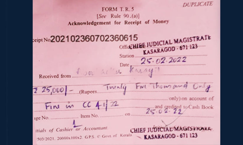 അബൂബക്കർ കാരായിൽ എന്നയാൾക്കാണ് മകൻ വാഹനമോടിച്ചതിന് കോടതി പിഴ ചുമത്തിയത്. 25000 രൂപ പിഴയടച്ചതിന്റെ റസിപ്റ്റ് കേരള പൊലീസ് ഫേസ്ബുക്ക് പേജിൽ പങ്കുവെക്കുകയും ചെയ്തു.