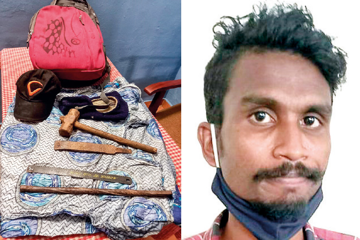 ചുറ്റിക, ഇരുമ്പ് ദണ്ഡ്, ഉളി എന്നിവയടങ്ങിയ സ്കൂള് ബാഗ് ഇയാളുടെ പക്കല് നിന്ന് കണ്ടെത്തി. ആലപ്പുഴയില് നിന്ന് പ്രണയിച്ച് വിവാഹം കഴിച്ചതില് ഒരു കുട്ടിയുണ്ട്. കുട്ടിക്ക് വാങ്ങിയ ഉടുപ്പുകളും ബാഗിലുണ്ടായിരുന്നു. പിണങ്ങിപ്പോയ ഭാര്യയെ അനുനയിപ്പിക്കാന് കുട്ടിക്ക് സ്വര്ണമാലയുമായി ആലപ്പുഴയിലേക്ക് പോകാനായിരുന്നു മോഷണപദ്ധതിയെന്ന് യുവാവ് മൊഴി നല്കി. ഇയാൾ ചോറ്റാനിക്കര തിരുവാണിയൂരിൽ ഹോട്ടല് ജോലിയും തൊടുപുഴ വെങ്ങല്ലൂരില് കാന്സര് സെൻററില് വെല്ഡിങ് ജോലിയും ചെയ്തിരുന്നു.