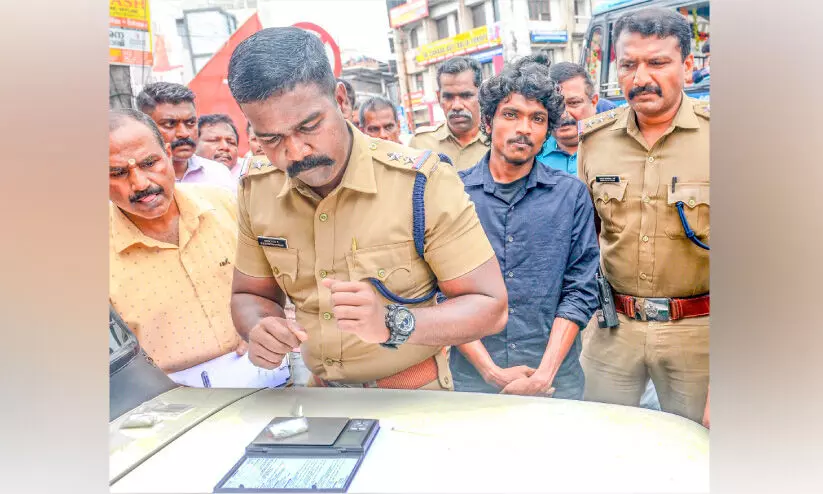 text_fieldsകോട്ടയം ബേക്കർ ജങ്ഷനിൽ ബസിൽനിന്ന് ഡാൻസാഫ് സംഘം പിടികൂടിയ എം.ഡി.എം.എ പരിശോധിക്കുന്നു.