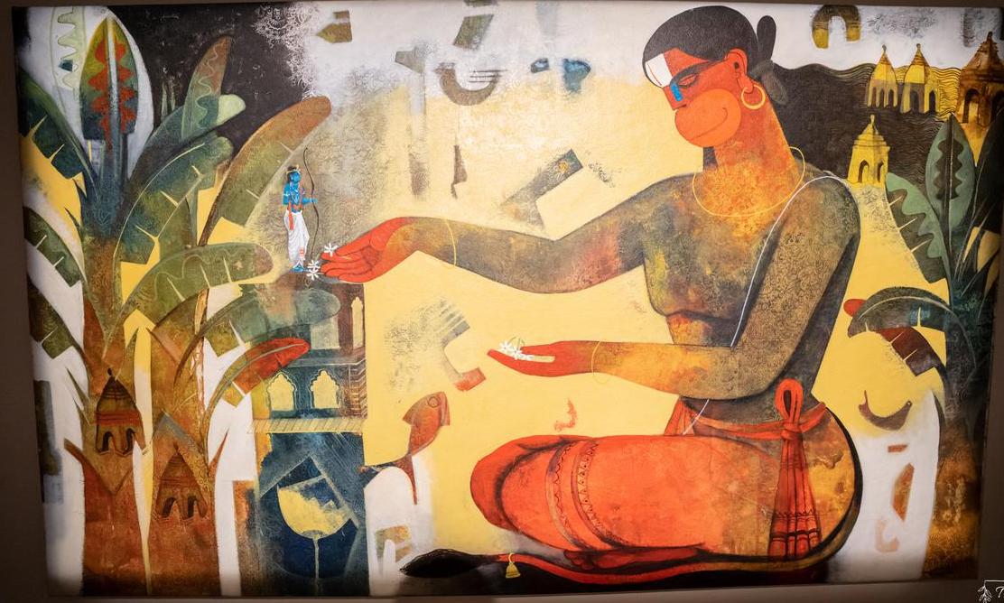 അക്രിലിക് ചായം ചെയ്ത ഫൈബർ ഗ്ലാസിൽ തീർത്ത ഹനുമാന്റെ ശില്പം ബാല്യകാലം മുതൽ വിവരിക്കുന്നതാണ്. ബാല്യത്തിൽ സൂര്യനടുത്തേക്ക് ചാടിക്കയറിയത് മുതൽ മൃതസഞ്ജീവനിയുമായി വരുന്നതും, രാമനിൽ നിന്നും സീതയിൽ നിന്നും അനുഗ്രഹം വാങ്ങുന്നതുവരെ ഒരേ കാൻവാസിൽ നൃത്തതാളത്തിൽ അവതരിപ്പിച്ചിരിക്കുന്നു. ഹനുമാന്റെ സർവ ഭക്തിഭാവങ്ങളെല്ലാം രാഘവ കോറിയിട്ടിട്ടുണ്ട്.