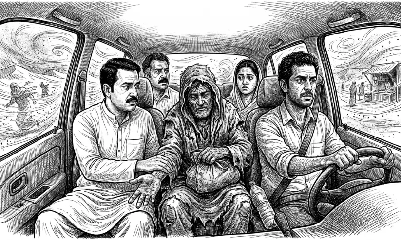 കണ്ടാൽ കാറ്റു കൂട്ടിയ ചണ്ടിക്കൂന പോലുള്ളൊരു മനുഷ്യരൂപം. കീറിപ്പറിഞ്ഞ പൈജാമയും കുർത്തയും, കയ്യിൽ ഒരു ഇടത്തരം ബാഗും. എവിടെ നിന്നോ കാറ്റിനോട് പൊരുതി വന്ന് അയാൾ ഞങ്ങളുടെ വണ്ടിക്കു നേരെ കൈ നീട്ടി. അപ്പോൾ വണ്ടിയിലുള്ള ജീവകാരുണ്യ പ്രവർത്തകെൻറ മനസ്സലിഞ്ഞു. അത് മരുമഴയായി പെയ്യാൻ തുനിഞ്ഞപ്പോൾ അയാൾ ചോദിച്ചു: ‘നിർത്തിയാലോ?’ എന്ന് ചോദിച്ചു.