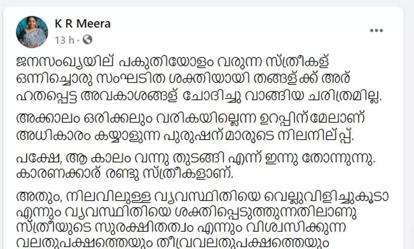text_fieldsകോട്ടയം: തങ്ങളുടെ തന്നെ പാർട്ടിയിലെ പുരുഷാധിപത്യത്തിനെതിരെ പോരാടുന്ന രണ്ട് സ്ത്രീകൾക്ക് വിജയാശംസകൾ നേർന്നുകൊണ്ട് എഴുത്തുകാരി കെ.ആർ മീര. മുഖ്യധാരാ രാഷ്ട്രീയ പാർട്ടികളായ കോൺഗ്രസും ബി.ജെ.പിയും സീറ്റ് നിഷേധിച്ചതിൽ പരസ്യമായി പ്രതിഷേധിച്ച വനിതാനേതാക്കൾക്ക് പിന്തുണ അറിയിച്ചുകൊണ്ടാണ് എഴുത്തുകാരി ഫേസ്ബുക്കിൽ കുറിപ്പിട്ടത്.