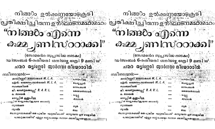 text_fields"നിങ്ങളെന്നെ കമ്മ്യുണിസ്റ്റാക്കി " - കേരളചരിത്രത്തിലെ ഒരു നാഴികക്കല്ലായ ഈ നാടകം സപ്തതിയുടെ നിറവിൽ. ചവറ എന്ന ഗ്രാമത്തിലെ ഓലമറച്ചുകെട്ടിയ സുദർശന എന്ന കൊട്ടകയിലായിരുന്നു ആദ്യ പ്രദർശനം. സംഘർഷമുണ്ടാകുമെന്നു പ്രതീക്ഷിച്ചു വലിയ പൊലീസ് സന്നാഹമുണ്ടായിരുന്നു. പക്ഷേ, നാടകം കഴിഞ്ഞപ്പോൾ എതിർക്കാൻ വന്നവരും നിശ്ശബ്ദരായിപ്പോയെന്നാണ് പറയുന്നത്. അഞ്ചുമണിക്കൂർ ദൈർഘ്യമുണ്ടായിരുന്ന നാടകം പിൽക്കാലത്ത് രണ്ടേകാൽ മണിക്കൂറായി.
