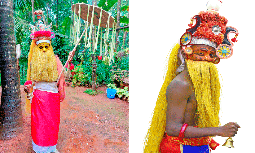 മുഖത്ത് മുന്നിൽ കാണപ്പെടുന്ന മീശയും, വാർമുടി പോലെ കിടക്കുന്ന ചാമരവും നിർമിക്കുന്നത് കദളി വാഴ മുറിച്ചാണ്. അതിന്റെ തണ്ട് ചീന്തി ഉണക്കി കാർന്നെടുത്ത നാര് ഉപയോഗിച്ച് മുടിപോലെ ഉണ്ടാക്കിയെടുക്കുന്നു. ഇപ്പോൾ ഇതെല്ലാം പ്ലാസ്റ്റിക് ഉപയോഗിച്ചുള്ള നിർമിതിയിലേക്ക് മാറി. കാഴ്ചയിൽ കുറച്ചുകൂടെ മേന്മയുണ്ടാവുമത്രെ. കൂടാതെ കാലങ്ങളോളം നീണ്ടുനിൽക്കുന്നതിനാലും സൗകര്യപ്രദമാണ്. കവുങ്ങിന്റെ പാള കോട്ടി ഒരു തൊപ്പി രൂപത്തിലാക്കി ചുവപ്പ് തുണി കൊണ്ട് പൊതിഞ്ഞ് അതിൽ പൂവുകൾ വെച്ച് അലങ്കരിച്ചാണ് തലയിൽ വെക്കുന്ന കിരീടം ഉണ്ടാക്കുന്നത്. ഇപ്പോൾ പൂവുകൾക്ക് പകരം വർണക്കടലാസുകളാണ് ഉപയോഗിക്കുന്നതെന്ന് പറയുന്നു.