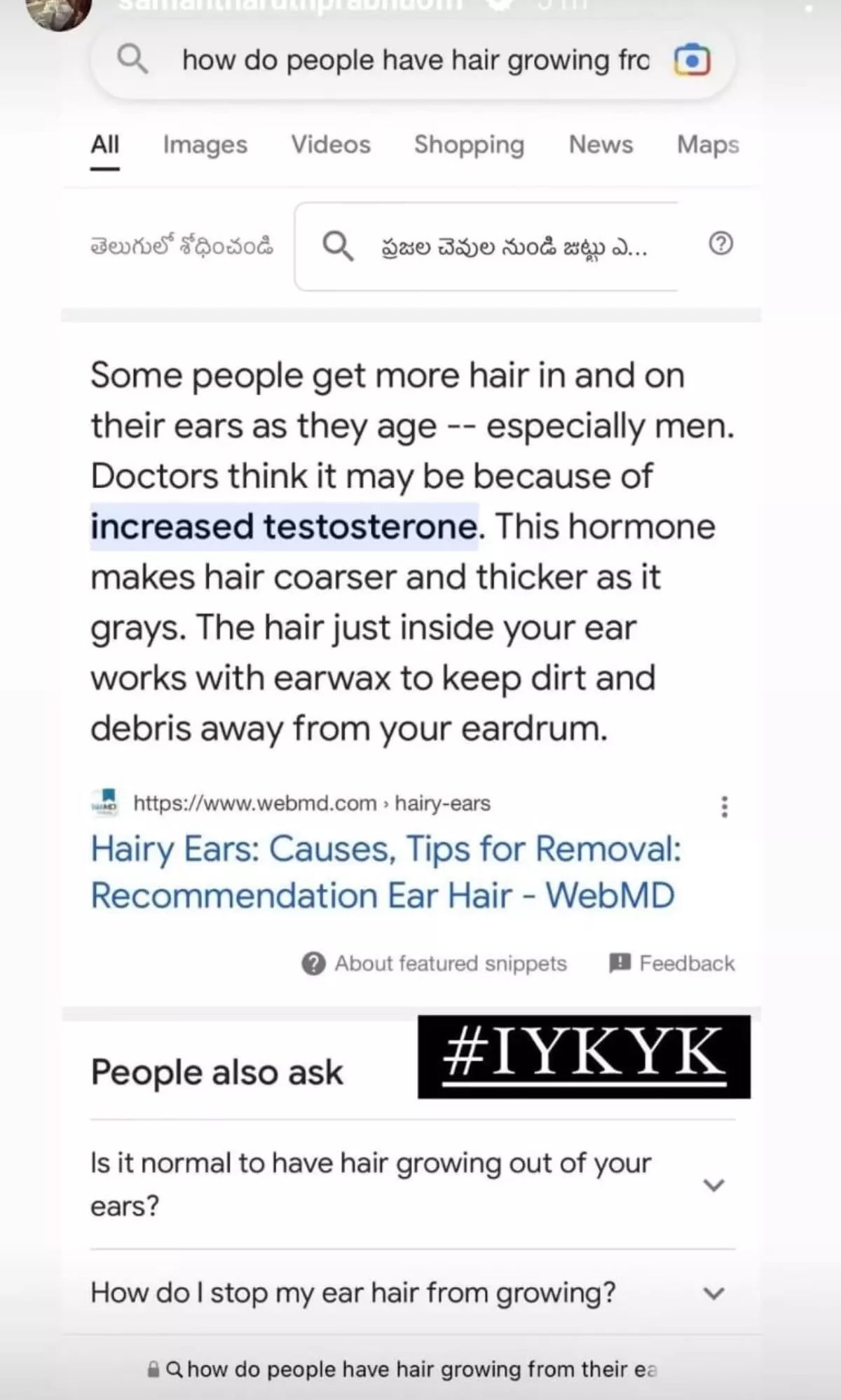 ‘എങ്ങനെയാണ് ആളുകള്ക്ക് ചെവിയില് നിന്നും മുടി വളരുന്നത്’ എന്ന സ്ക്രീൻഷോട്ടിനോടൊപ്പം ടെസ്റ്റോസ്റ്റിറോണിന്റെ അളവ് കൂടുന്നതാണ് ചെവിയില് മുടി വളരുന്നതിന്റെ കാരണം എന്നുള്ള സ്ക്രീന് ഷോട്ടും പങ്കുവെച്ചിട്ടുണ്ട്. IYKYK’ (If you know you know) എന്നും സാമന്ത കുറിച്ചിട്ടുണ്ട്. നടിയുടെ വാക്കുകൾ സോഷ്യൽ മീഡിയയിൽ വൈറലാണ്. ഇതിലും മികച്ച മറുപടിയില്ലെന്നാണ് ആരാധകർ പറയുന്നത്.