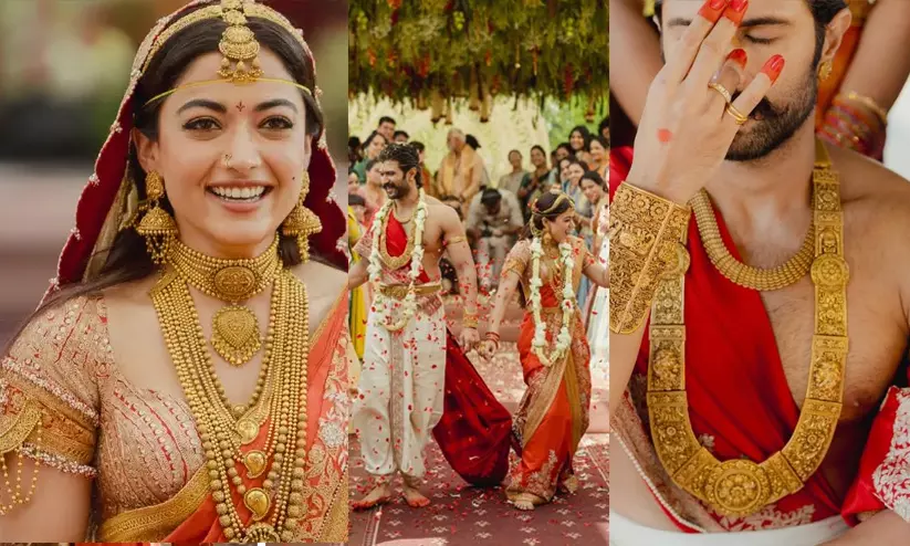 text_fieldsആരാധകർ സ്നേഹത്തോടെ വിരോഷ് എന്ന് വിളിക്കുന്ന രശ്മിക മന്ദാനയുടെയും വിജയ് ദേവരകൊണ്ടയുടെയും വിവാഹം ഈ വർഷത്തെ ഏറ്റവും വലിയ ആഘോഷങ്ങളിലൊന്നായി മാറിയിരിക്കുകയാണ്. ഉദയ്പൂരിൽ നടന്ന രാജകീയ വിവാഹ ചടങ്ങിലെ പ്രധാന ആകർഷണം രശ്മിക അണിഞ്ഞ കോടികൾ വിലമതിക്കുന്ന സ്വർണ്ണാഭരണങ്ങളായിരുന്നു. റിപ്പോർട്ടുകൾ പ്രകാരം വിവാഹത്തിനായി പ്രത്യേകം രൂപകൽപ്പന ചെയ്ത ടെമ്പിൾ സ്റ്റൈൽ സ്വർണ്ണാഭരണങ്ങൾക്ക് മാത്രം 4 കോടി മുതൽ 7 കോടി രൂപ വരെ വില വരും. ഏകദേശം 2 മുതൽ 3 കിലോഗ്രാം വരെ തൂക്കമുള്ള ഈ ആഭരണങ്ങൾ നിർമിക്കാൻ മാത്രം 10 മാസത്തോളം സമയമെടുത്തു. ഓരോ ചെറിയ ഭാഗവും അത്രമേൽ സൂക്ഷ്മതയോടെ കൈകൊണ്ട് പണിതീർത്തത്.