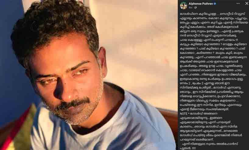 NOTE * ഗോൾഡ് അങ്ങനെ എടുക്കാമായിരുന്നു...ഇങ്ങനെ എടുക്കാമായിരുന്നു എന്ന് പറയരുത് . കാരണം...ഞാനും ഗോൾഡ് എന്ന സിനിമ ആദ്യമായിട്ടാണ് എടുക്കുന്നത്...നേരത്തെ ഗോൾഡ് ചെയ്തു ശീലം ഉണ്ടെങ്കിൽ നിങ്ങൾ പറയുന്നത് ശെരിയാണ്. എന്ന് നിങ്ങളുടെ സ്വന്തം അൽഫോൻസ് പുത്രൻ'- ഫേസ്ബുക്കിൽ കുറിച്ചു.