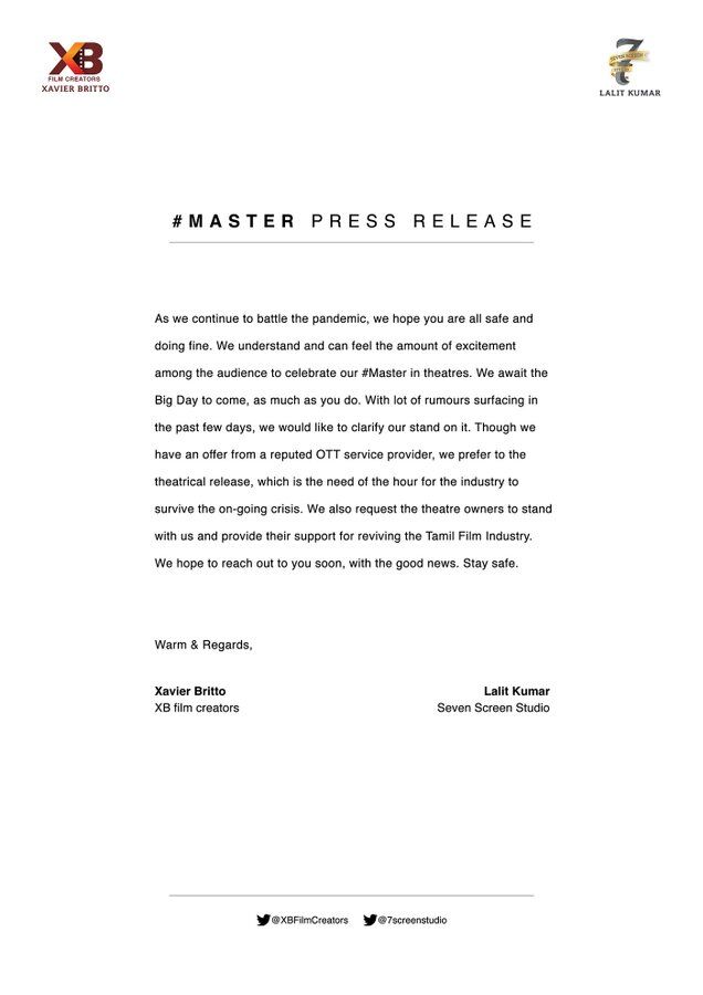 മാസ്റ്റർ തിയറ്ററിൽ തന്നെ കാണാം: ഒ.ടി.ടി റിലീസില്ലെന്ന് അണിയറപ്രവർത്തകർ