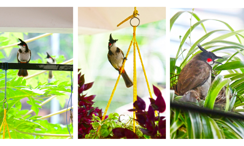 കൂടുകൂട്ടാനൊരു ഇടം തേടി: ചെടികൾ തൂക്കിയിരിക്കുന്ന കമ്പിയിൽ വന്നിരുന്ന് കൂടൊരുക്കാൻ ഇടംതേടുന്ന ബുൾബുൾ പക്ഷികൾ,