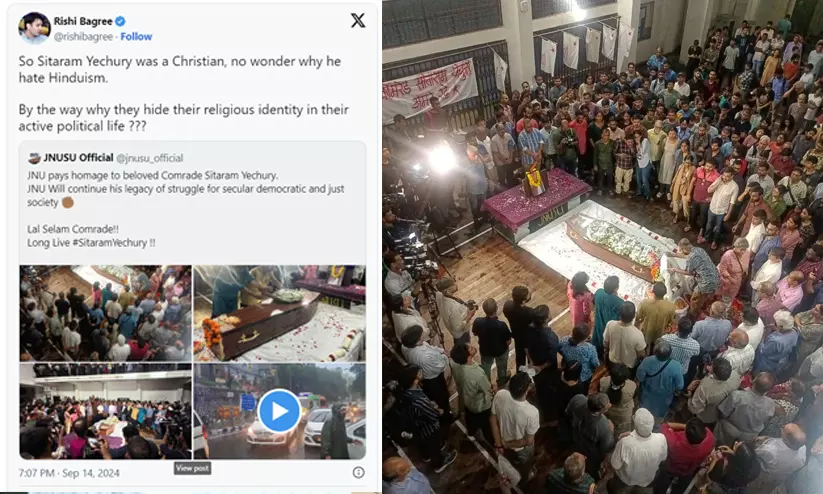 ‘സീതാറാം യെച്ചൂരി ക്രിസ്ത്യാനിയായിരുന്നു. അപ്പോൾ എന്തുകൊണ്ടാണ് അദ്ദേഹം ഹിന്ദുമതത്തെ വെറുക്കുന്നത് എന്നതിൽ അദ്ഭുതമില്ല. എന്നാലും എന്തിനാണ് അവർ തങ്ങളുടെ മതസ്വത്വം രാഷ്ട്രീയ ജീവിതത്തിൽ മറച്ചുവെക്കുന്നത് ???’ -എന്നാണ് സോഷ്യൽ മീഡിയ ഹാൻഡിലുകളിൽ പതിവായി സാമുദായിക വിദ്വേഷം പ്രചരിപ്പിക്കുന്ന ഋഷി ബഗ്രി എന്നയാളുടെ ട്വീറ്റ്. ജെ.എൻ.യുവിൽ മൃതദേഹം എത്തിച്ചതിന്റെ ചിത്രങ്ങളും വിഡിയോകളും പങ്കുവെച്ചായിരുന്നു ഇയാളുടെ ആരോപണം.