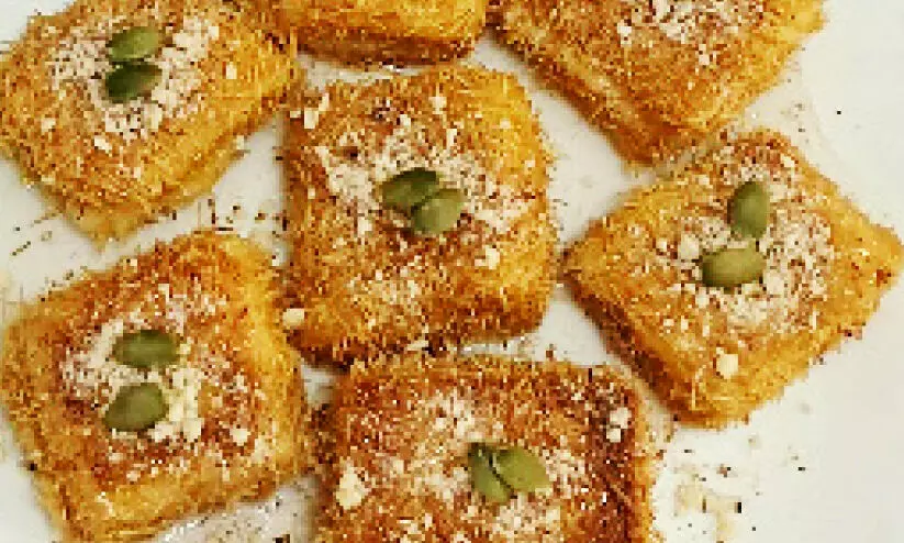 text_fieldsതീന്മേശയിലെ ട്രെൻഡുകളിലൊന്നാണ് കുനാഫ. നോമ്പുകാലത്തെ രാത്രികളിലും ആഘോഷവേളകളിലുമെല്ലാം വിളമ്പാവുന്ന മധുര വിഭവം. പെരുന്നാൾ ദിനത്തിൽ അതിഥികൾക്ക് സൽക്കരിക്കാവുന്ന രുചികരമായി കുനാഫയെ പരിചയപ്പെടാം.