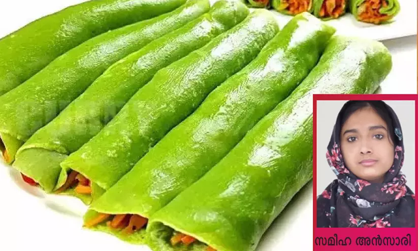 ശേഷം ഇതിലേക്ക് ജൂലിയൻ കട്ട് ചെയ്ത കാരറ്റ്, റെഡ്, യെല്ലോ, ഗ്രീൻ ക്യാപ്സികം പകുതി വീതം നീളത്തിൽ മുറിച്ചതും ഉപ്പ്, പെപ്പർ പൗഡർ ചേർത്തിളക്കി മൂടി വെച്ച് രണ്ട് മിനിറ്റ് കുക്ക് ചെയ്യുക. വെജ് ഫില്ലിങ് റെഡി. ശേഷം തയാറാക്കി വെച്ച കുക്കുമ്പർ പാൻകേക്കിൽ നിന്ന് ഓരോന്നായി എടുത്ത് വെജ് ഫില്ലിങ് ഓരോ ടേബിൾ സ്പൂൺ വീതം ഫില്ലിങ് വെച്ച് നല്ല ടൈറ്റായി റോൾ ചെയ്യുക. ഇങ്ങനെ എല്ലാം ചെയ്ത ശേഷം കട്ട് ചെയ്ത് സർവ് ചെയ്യാം. വെജ് ഫില്ലിങിന് പകരം ചിക്കൻ ഫില്ലിങ്, ഫിഷ് ഫില്ലിങ് വെച്ചും തയാറാക്കാം.