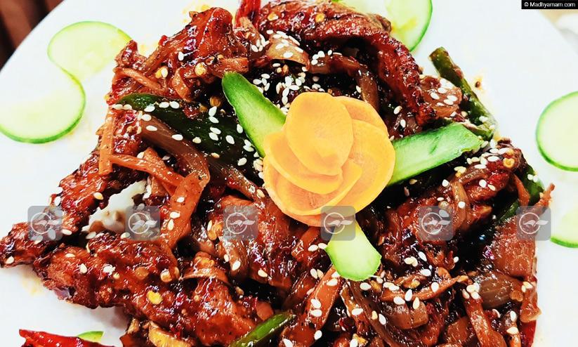 ചിക്കൻ, ക്യാപ്സിക്കം, സവാള എന്നിവ നീളത്തിൽ അരിഞ്ഞുവെക്കുകയാണ് ആദ്യം ചെയ്യേണ്ടത്. ശേഷം മുട്ട, കോൺഫ്ളോർ, കുറച്ച് ഉപ്പ്, സോയാ സോസ്, റെഡ് ചില്ലി പേസ്റ്റ്, കുരുമുളക് പൊടി, ഇഞ്ചി-വെളുത്തുള്ളി പേസ്റ്റ് എന്നിവ നന്നായി യോജിപ്പിച്ച് ചിക്കനിൽ നന്നായി പുരട്ടി 15 മിനിട്ട് വെയ്ക്കുക.