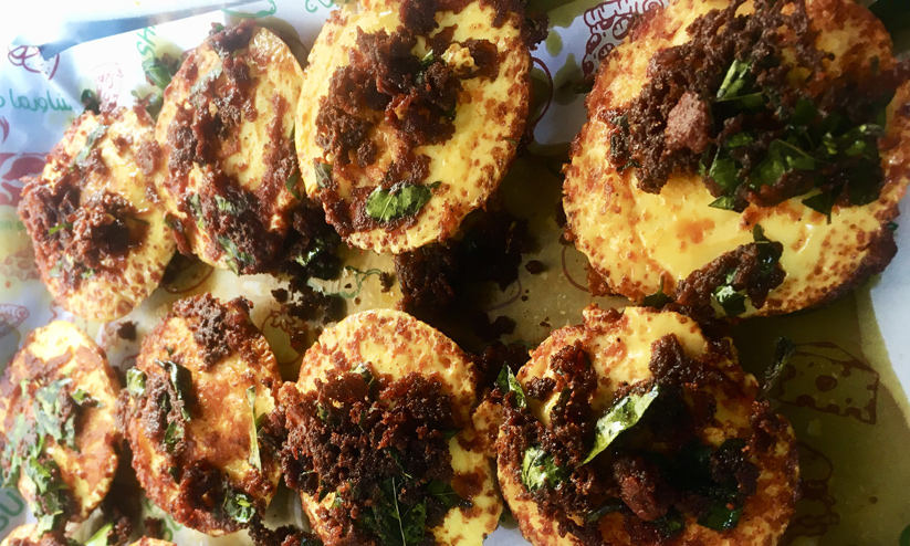 ഓരോ മുട്ടയും പൊട്ടിച്ച് ഇഡ്ഡലി തട്ടിൽ കലങ്ങാതെ ഒഴിച്ച് ഇഡ്ഡലി പോലെ 10 മിനിട്ട് ആവിയിൽ വേവിച്ചെടുക്കുക. മുട്ട ഒഴിക്കുന്നതിനു മുന്പ് ഇഡ്ഡലിത്തട്ടിൽ കുറച്ച് എണ്ണ പുരട്ടണം. അതു തണുത്ത ശേഷം തട്ടിൽ നിന്ന് ഇളക്കി എടുക്കുക. ഒരു ടേബിൾ സ്പൂൺ മുളകുപൊടിയും കുരുമുളകുപൊടിയും 1/2 ടീസ്പൂൺ ഗരം മസാല പൊടിയും 1/4 ടീസ്പൂൺ മഞ്ഞൾ പൊടിയും ഇഞ്ചി വെളുത്തുള്ളി പേസ്റ്റും ആവശ്യത്തിനുള്ള ഉപ്പും കറിവേപ്പിലയും കൂട്ടി ചേർത്ത് പേസ്റ്റ് രൂപത്തിൽ മസാല തയാറാക്കുക.