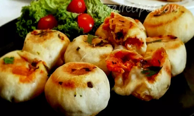 4. തയ്യാറാക്കിയ മാവിൽ നിന്ന് 10 - 12 ഉരുളകൾ ഉണ്ടാക്കുക. ഇത് ഓരോന്നായി ചെറിയ വൃത്താകൃതിയിൽ പരത്തി, അതിലേക്ക് കുറച്ചു പിസ്സ സോസും ക്രീം ചീസും ചേർത്ത്, തുടർന്ന് ചിക്കൻ മിക്സും അല്പം മൊസറെല്ല ചീസും ചേർക്കുക. ഫില്ലിംഗ് മൂടാൻ അടച്ച് കൈപ്പത്തിയിൽ ചെറുതായി ഉരുട്ടി ഒരു ബോൾ ആകൃതി ഉണ്ടാക്കുക.