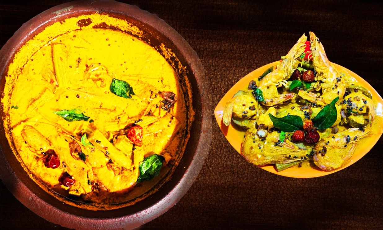 മുക്കാൽ ഭാഗം വേവാകുമ്പോൾ കഴുകി വൃത്തിയാക്കി വെയ്ൻ മാറ്റിയ ചെമ്മീനും തലയും ചേർക്കണം. ചെമ്മീൻതല ചേർത്താൽ കറിക്ക് രുചികൂടും. തിളച്ചു വരുമ്പോൾ തീ ഓഫ് ചെയ്ത് വെളിച്ചെണ്ണയിൽ കടുക്, ഉലുവ, ചെറിയഉള്ളി, കറിവേപ്പില, വറ്റൽമുളക് വറുത്തിട്ട് ചൂടോടെ െസർവ് ചെയ്യാം.