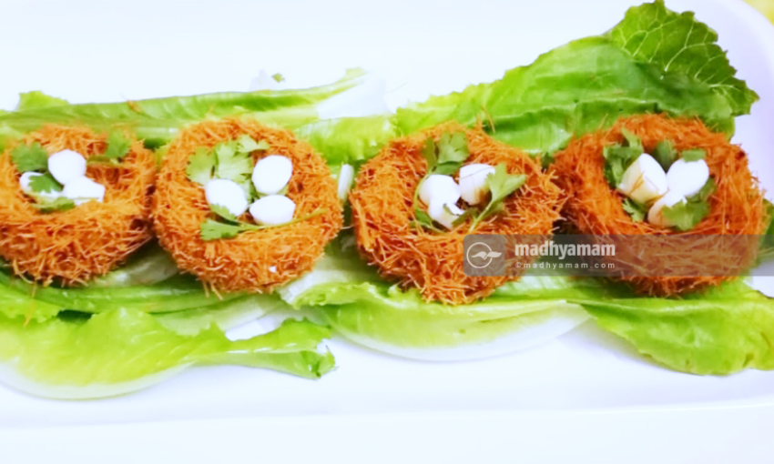 ഇതിെൻറ മുകളിൽ പുഴുങ്ങിയ മുട്ടയുടെ വെള്ള ചെറിയ മുട്ടയുടെ ആകൃതിയിൽവെച്ച് അലങ്കരിച്ചാൽ മനോഹരമായ കിളിക്കൂട് തയാറായി.