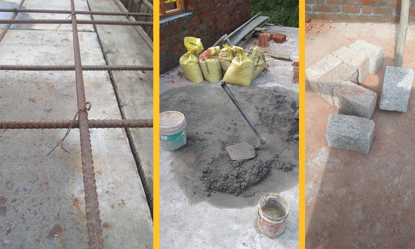 4.) രണ്ടാം നില പണിയുമ്പോൾ ഒന്നാം നിലയുടെ സ്ലാബിൽ ഇട്ടു എട്ട് ഇഞ്ച് കട്ട/കല്ല്/ഹോളോബ്രിക്സ് തല്ലി പൊട്ടിക്കുക
