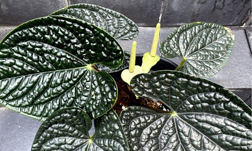 ആന്തൂരിയം ലക്സൂരിയൻസ് ഡാർക്കിന്റെ ഇലകളുടെ ഭംഗിയാണ് ഈ ചെടിയെ കൂടുതൽ ആകർഷമാക്കുന്നത്. ചെറിയ ഇലകൾക്ക് വെള്ളി നിറമാണ്. ഇലകൾ വലുതാകുമ്പോൾ കടുത്ത പച്ച നിറമായി മാറും.