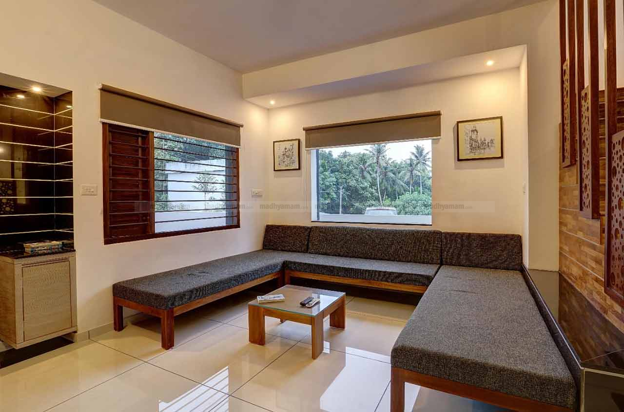 സിറ്റൗട്ട് ഡ്രോയിങ് റൂം, ലിവിങ് റൂം, അടുക്കള, വർക്ക് ഏരിയ, ബാൽക്കണി, കോർട്ട്യാർഡ്, അറ്റാച്ചഡ് ബാത്റൂമോടുകൂടിയ മൂന്ന് കിടപ്പു മുറികൾ എന്നിവയാണ് ഒരുക്കിയിരിക്കുന്നത്. കാറ്റും വെളിച്ചവും യഥേഷ്ടം ഉള്ളിലേക്കെത്തിക്കാൻ ഒാപണിങ്ങുകളും നീളൻ ജനാലകളും നൽകി. പകൽ സമയങ്ങളിൽ ലൈറ്റിെൻറയോ ഫാനിെൻറയോ ഉപയോഗം വരുന്നതേയില്ല.