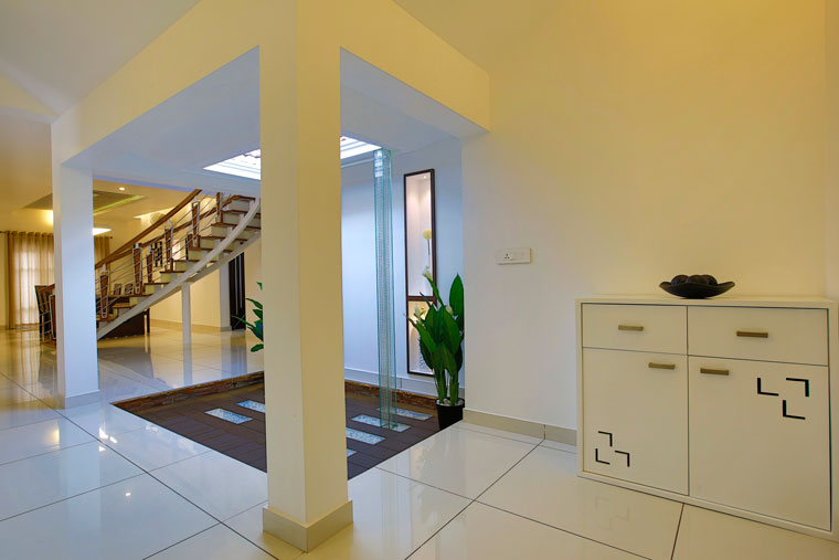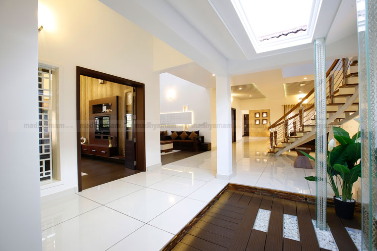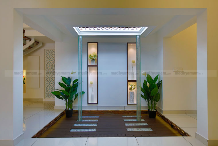വീടിനകത്ത് നടുക്കായി സജ്ജീകരിച്ചിട്ടുള്ള കോർട്ട്യാർഡാണ് ശ്രദ്ധാകേന്ദ്രം. ഈ കോർട്ട്യാർഡിനെ ബന്ധിപ്പിച്ചാണ് ബാക്കി സ്പേസുകളുടെ ഒരുക്കങ്ങൾ. ഗ്ലാസിെൻറ പർഗോളക്ക് സപ്പോർട്ട് നൽകിയിരിക്കുന്നത് ജി.ഐ ഫ്രെയിം ആണ്. ഏതൊരു സ്പേസിൽ നിന്നും ഈ കോർട്ട്യാർഡിലേക്ക് കാഴ്ച എത്തുംവിധമാണ് ക്രമീകരിച്ചിട്ടുള്ളത്.
