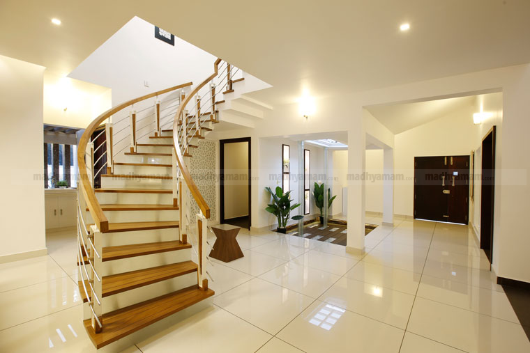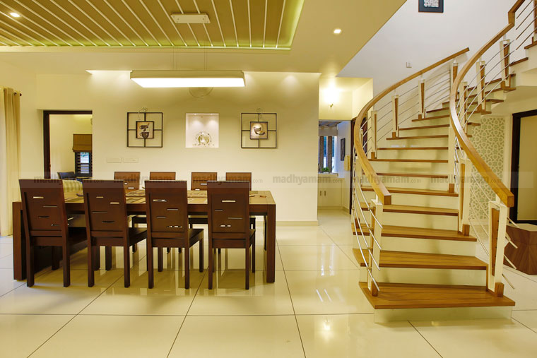 ഡബിൾ ഹൈറ്റ് സ്പേസിലാണ് സ്റ്റെയർ കേസ് ഡിസൈൻ. ഇവിടെ കൊടുത്തിട്ടുള്ള സ്കൈലൈറ്റിയുടെ വരുന്ന സൂര്യപ്രകാശം അകത്തളങ്ങളെ പ്രകാശ പൂരിതമാക്കുന്നു. പത്തു പേർക്ക് ഒരേസമയം ഇരുന്ന് ഭക്ഷണം കഴിക്കാവുന്ന വിധമുള്ള ഡൈനിങ് ടേബിളാണ് ഇവിടെ കൊടുത്തിട്ടുള്ളത്.