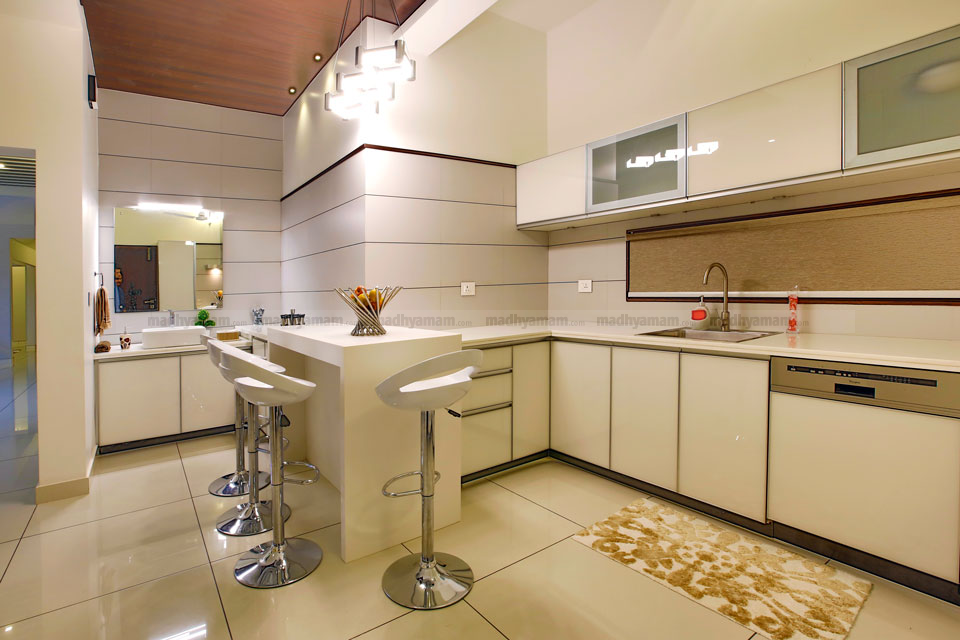 പ്രൗഢ ഗംഭീരമായിട്ടാണ് അടുക്കള ഡിസൈൻ വിശാലമായ ഡിസൈൻ രീതിയാണിവിടെ. ബ്രേക്ക് ഫാസ്റ്റ് കൗണ്ടറിനും ഇവിടെ സ്ഥാനം കൊടുത്തിട്ടുണ്ട്. കിച്ചെൻറ കൗണ്ടർ ടോപ്പിന് ബ്ലാക് ഗ്രാനെറ്റാണ്.