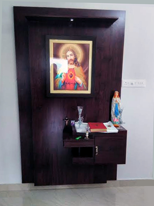 ഡൈനിങ്സ് പേസ്വലിയ ഹാളായാണ് നൽകിയിരിക്കുന്നത്. ഡൈനിങ്ങ്ഏരിയയിലാണ് പ്രാർഥനാ മുറിക്കായി സ്പേസ്കണ്ടെത്തിയിരിക്കുന്നത്. മുറിയായി പ്രത്യേകം വേർതിരിക്കാതെ ഒഴിഞ്ഞ കോർണറിൽ ചുവരിൽ എം.ഡി.എഫ് പാനലും സ്റ്റാൻഡും നൽകി വുഡൻ പെയിൻറടിച്ച് മനോഹരമാക്കി.