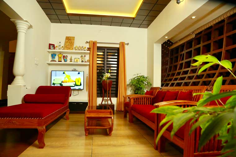 വീട്ടിലേക്കെത്തുന്ന അതിഥികളുടെ മനസിൽ കുളിർമയായി നിറഞ്ഞു നിൽക്കുന്ന വീടെന്ന് ഇതിനെ വിശേഷിപ്പിക്കാം. ചുറ്റുവരാന്തകളും ഇരിപ്പിട സൗകര്യങ്ങളും വെയിലും മഴയും വന്നെത്തുന്ന നടുമുറ്റവും സംഗീതസാന്ദ്രമായ അന്തരീക്ഷം അതിഥികൾക്ക് പ്രിയപ്പെട്ടതാക്കുന്നു. താളാത്മകമായി ഉള്ളിലേക്കെത്തുന്ന കാറ്റിനും വെളിച്ചത്തിനും സ്വാഗതമരുളി ആവശ്യാനസുരണം കയറി ഇറങ്ങാൻ പാകത്തിന് ഒരുക്കിയ ജനാലുകളും ഒാപണിങ്ങുകളും എല്ലാം അകത്തളങ്ങളിൽ പോസിറ്റീവ് എനർജി കാത്തു സൂക്ഷിക്കുന്നു.
