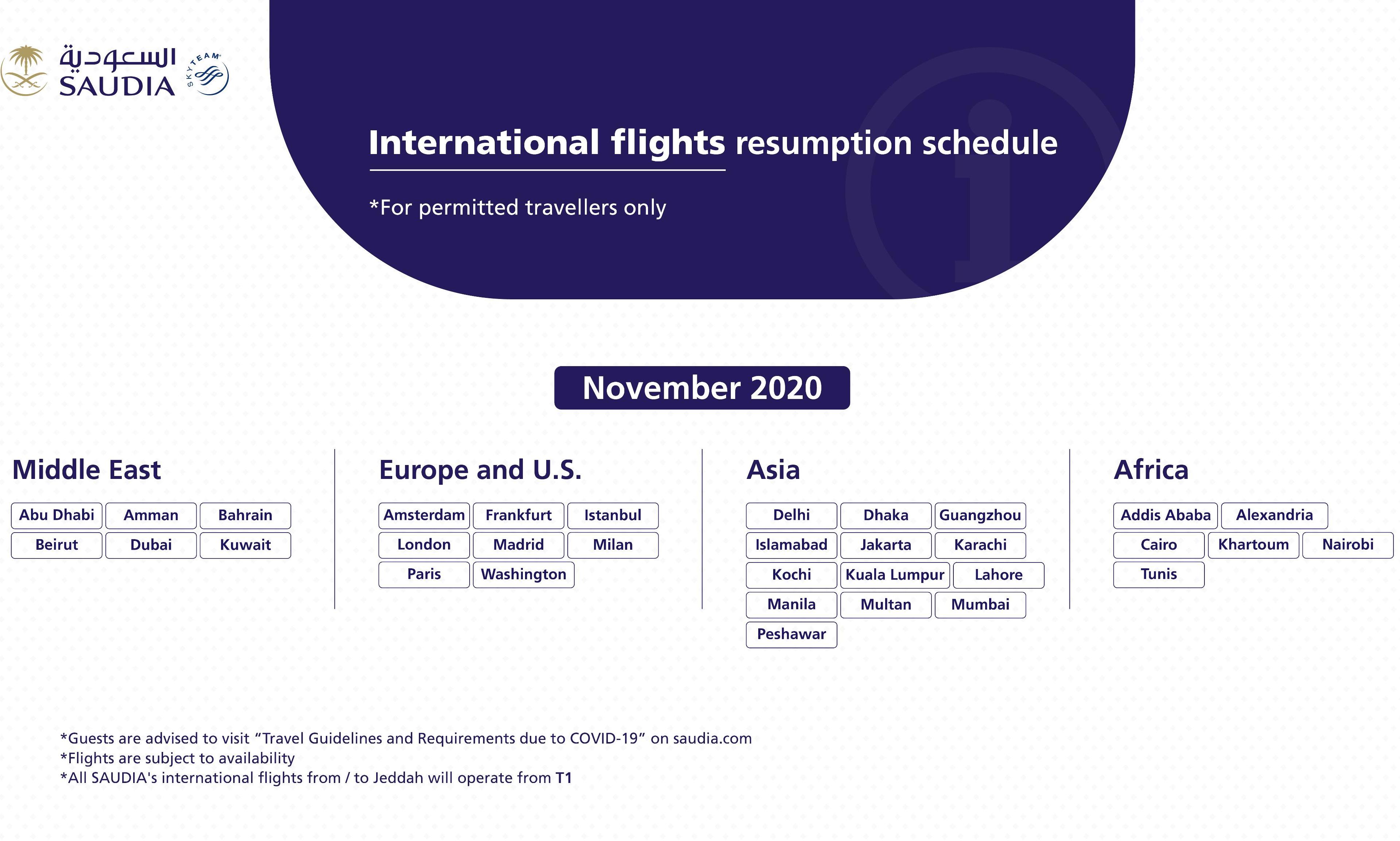 ഏഷ്യയിൽ മൊത്തം 13 സ്ഥലങ്ങളിലേക്കും മധ്യപൗരസ്ത്യ മേഖലയിൽ ആറിടങ്ങളിലേക്കും സർവിസ് നടത്തും. യൂറോപ്പിലും അമേരിക്കയിലുമായി എട്ട് വിമാനത്താവളങ്ങളിലേക്ക് സർവിസുണ്ട്. ആഫ്രിക്കയിൽ ആറ് സ്ഥലങ്ങളിലേക്കും സർവിസ് നടത്തും. കോവിഡ് പ്രോേട്ടാക്കോൾ പാലിച്ചായിരിക്കും യാത്രക്കാരെ യാത്രക്ക് അനുവദിക്കുക. വിമാനങ്ങളുടെ ലഭ്യത അനുസരിച്ചായിരിക്കും സർവിസെന്നും അറിയിപ്പിൽ പറയുന്നു.