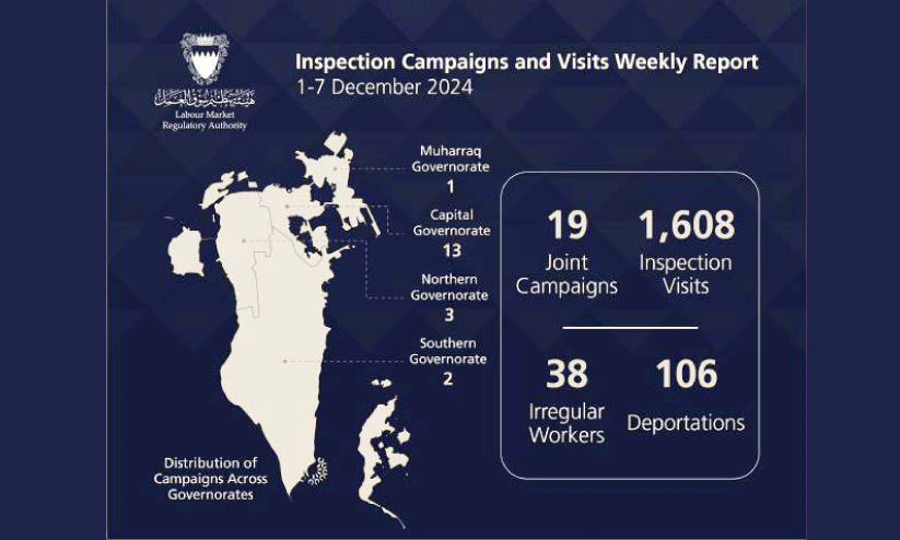 19 സംയുക്ത പരിശോധനാ കാമ്പയിനുകൾ നടത്തി. ഇതിനു പുറമേ, ക്യാപിറ്റൽ ഗവർണറേറ്റിൽ 13 കാമ്പയിനുകൾ നടന്നു. മുഹറഖ് ഗവർണറേറ്റിൽ ഒന്ന്, നോർതേൺ ഗവർണറേറ്റിൽ മൂന്ന്, സതേൺ ഗവർണറേറ്റിൽ രണ്ട് എന്നിങ്ങനെ പരിശോധനാ കാമ്പയിനുകൾ നടത്തി.