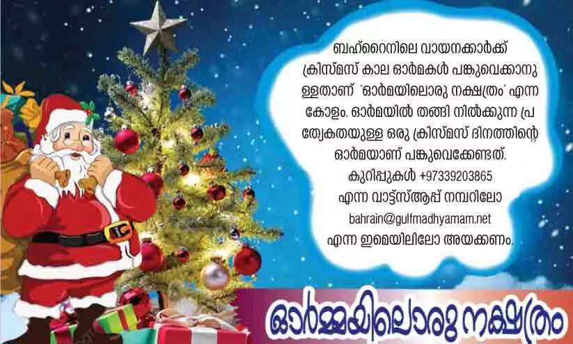 text_fieldsപതിയാരക്കര എന്ന ഞങ്ങളുടെ കൊച്ചു ഗ്രാമത്തിൽ ക്രിസ്ത്യൻ കുടുംബം ഇല്ലെങ്കിലും ക്രിസ്മസ് പരീക്ഷയും,ഒപ്പം കുട്ടികളുടെ പ്രസിദ്ധീകരങ്ങളിലെ ക്രിസ്മസ് പതിപ്പും കുഞ്ഞു നാളിൽ തന്നെ ഉണ്ണിയേശുവിനെ ജീവിതത്തിന്റെ ഭാഗമാക്കിയിരുന്നു.പിന്നീട് കുറച്ചു മുതിർന്നപ്പോൾ വടകര ഒരു പുസ്തക ക്കടയിൽ ജോലിക്ക് പോകാൻ തുടങ്ങിയപ്പോഴാണ് ആദ്യമായി കരോൾ കാണുന്നത്.നഗരത്തിലെ മൊത്ത കച്ചവടക്കുത്തക അക്കാലത്ത് കുന്നംകുളം സ്വദേശികളായ ക്രിസ്തീയ സഹോദരന്മായിരുന്നു എന്നതിനാൽ ഞാൻ ജോലി ചെയ്യുന്ന സ്ഥാപനത്തിലേക്ക് സാധനങ്ങൾ വാങ്ങിക്കൊണ്ടിരുന്ന മൊത്ത കച്ചവടക്കാർ തരുന്ന കേക്കുകളിൽ നിന്നാണ് ക്രിസ്മസ് മധുരം ആദ്യമായി അനുഭവിക്കുന്നത്.