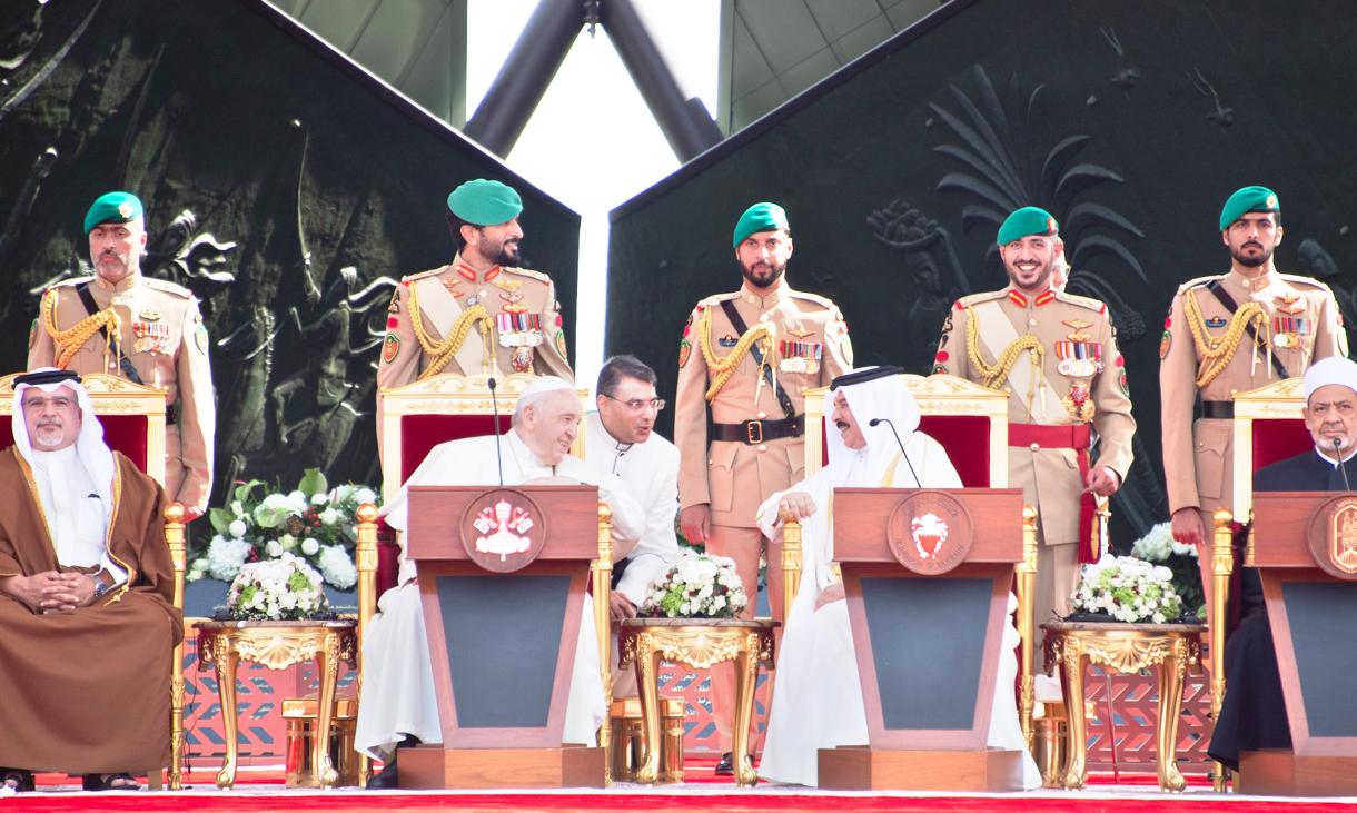 സഖീർ പാലസിലെ മെമ്മോറിയൽ ചത്വരത്തിൽ നടന്ന ബഹ്റൈൻ ഡയലോഗ് ഫോറത്തിന്റെ സമാപന ചടങ്ങിൽ രാജാവ് ഹമദ് ബിൻ ഈസ ആൽ ഖലീഫക്കൊപ്പം ഫ്രാൻസിസ് മാർപാപ്പയും അൽ അസ്ഹർ ഗ്രാൻഡ് ഇമാം ഡോ. അഹ്മദ് അൽ ത്വയ്യിബും കിരീടാവകാശിയും പ്രധാനമന്ത്രിയുമായ പ്രിൻസ് സൽമാൻ ബിൻ ഹമദ് ആൽ ഖലീഫയും പങ്കെടുത്തു. റോയൽ ബഹ്റൈനി എയർഫോഴ്സിന്റെ രണ്ട് ഹെലികോപ്ടറുകൾ ബഹ്റൈന്റെയും വത്തിക്കാന്റെയും ദേശീയപതാകകളേന്തി ആകാശത്ത് വട്ടമിട്ടുപറന്ന് അതിഥികൾക്ക് ആശംസകൾ അറിയിച്ചു. ഹമദ് രാജാവും മാർപാപ്പയും ഗ്രാൻഡ് ഇമാമും ചത്വരത്തിലെ ഈന്തപ്പനയുടെ ചുവട്ടിൽ വെള്ളമൊഴിച്ച് ശുഭപ്രതീക്ഷകളുടെ സന്ദേശം പകർന്നു.