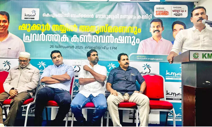 മനാമ: കെ.എം.സി.സി ബഹ്റൈൻ ബാലുശ്ശേരി മണ്ഡലം കമ്മിറ്റിയുടെ നേതൃത്വത്തിൽ മുസ്ലിം ലീഗ് നേതാവും കോഴിക്കോട് മെഡിക്കൽ കോളജ് സി.എച്ച് സെന്റർ സെക്രട്ടറിയും ജീവകാരുണ്യ പ്രവർത്തകനുമായ ഷുക്കൂർ തയ്യിൽ അനുസ്മരണവും മണ്ഡലം പ്രവർത്തക കൺവെൻഷനും സംഘടിപ്പിച്ചു. കെ.എം.സി.സി ബഹ്റൈൻ സംസ്ഥാന ജനറൽ സെക്രട്ടറി ശംസുദ്ദീൻ വെള്ളികുളങ്ങര ഉദ്ഘാടനം ചെയ്തു. മണ്ഡലം ആക്ടിങ് പ്രസിഡന്റ് കുഞ്ഞാലി അധ്യക്ഷത വഹിച്ചു.