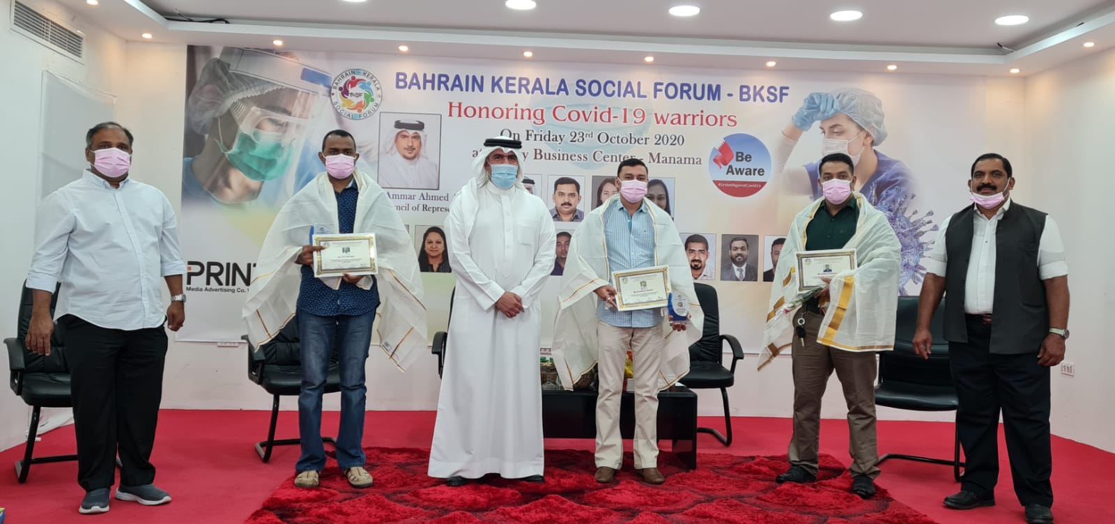 കഴിഞ്ഞ ഏഴ് മാസക്കാലമായി സ്വജീവിതം പണയപ്പെടുത്തി കോവിഡ് പോസിറ്റീവ് രോഗികളെ ചികിൽസിക്കുകയും ജീവിതത്തിലേക്കുള്ള അവരുടെ തിരിച്ചു വരവിനായി ആഹോരാത്രം പ്രയത്നിക്കുകയും ചെയ്തുകൊണ്ടിരിക്കുന്ന സമർപ്പിത സേവകരായ ശൈലേഷ് കാക്കുനി, ഷിന്റോ ജേക്കബ്, സബിൻ കുര്യൻ, നിബു തോമസ്, പ്രിയ ബെബു, ജിബി ജോൺ വർഗീസ്, ക്രിസ്റ്റീൻ ഡൽ റോസാറിയോ, ഫ്ലർമഫിന അസ്ക്വിറ്റാ, സിജോമോൻ എബ്രഹാം, ഖലീൽ ഇബ്രാഹിം അലി, ഹംസ കുന്നത്ത്, ടിറ്റോ മാത്യു, രാജഗോപാൽ രാജീവ്, സജിനി ക്രിസ്റ്റി, ഫൈസൽ പലയോട്ട്, സുജിത അനിൽ, സിന്ദി ജോബി എന്നിവരെയാണ് ആദരിച്ചത്.