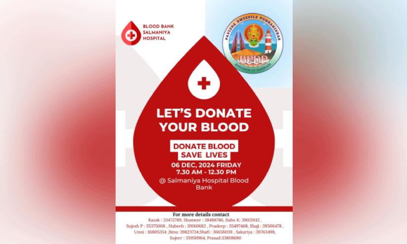 വെള്ളിയാഴ്ച രാവിലെ 7.30 മുതൽ 12.30 വരെ സൽമാനിയ ഹോസ്പിറ്റൽ ബ്ലഡ് ബാങ്കിലാണ് ക്യാമ്പ്. പങ്കെടുക്കാൻ താൽപര്യമുള്ളവർക്ക് 33472789, 39020112, 35375006, 39506478 എന്നീ നമ്പറുകളിൽ ബന്ധപ്പെടാവുന്നതാണെന്ന് റസാഖ് ചെറുവളപ്പിൽ, ബാബു കണിയാംപറമ്പിൽ, ഷമീർ പൊന്നാനി, സുജേഷ്, ഷാജി നെസ്റ്റോ എന്നിവർ അറിയിച്ചു.