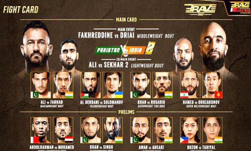 ഇന്ത്യൻ എം.എം.എ താരം എഹ്തേഷാം അൻസാരി ബ്രേവ് സി.എഫിന്റെ ഫ്ലൈവെയ്റ്റ് ഡിവിഷനിൽ അരങ്ങേറ്റം കുറിക്കുകയാണ് എന്ന പ്രത്യേകതയുണ്ട്. പാകിസ്താന്റെ അക്വിബ് അവാനുമായിട്ടാണ് എഹ്തേഷാം അൻസാരി ഏറ്റുമുട്ടുക. ഒരു പ്രഫഷനൽ എം.എം.എ റെക്കോഡുൾപ്പെടെ ആറ് വിജയങ്ങളുടെ ശ്രദ്ധേയമായ മുന്നേറ്റത്തിലാണ് എഹ്തേഷാം അൻസാരി. രാജ്യാന്തര മത്സരത്തിൽ തന്റെ കഴിവുകൾ പ്രദർശിപ്പിക്കാനുള്ള അവസരമാണ് ഇപ്പോൾ അദ്ദേഹത്തിന് ലഭിച്ചിരിക്കുന്നത്. ഇന്ത്യയും പാകിസ്താനുമായി നേരിട്ട് ഏറ്റുമുട്ടുന്ന മത്സരം ശ്രദ്ധ പിടിച്ചുപറ്റിക്കഴിഞ്ഞു.