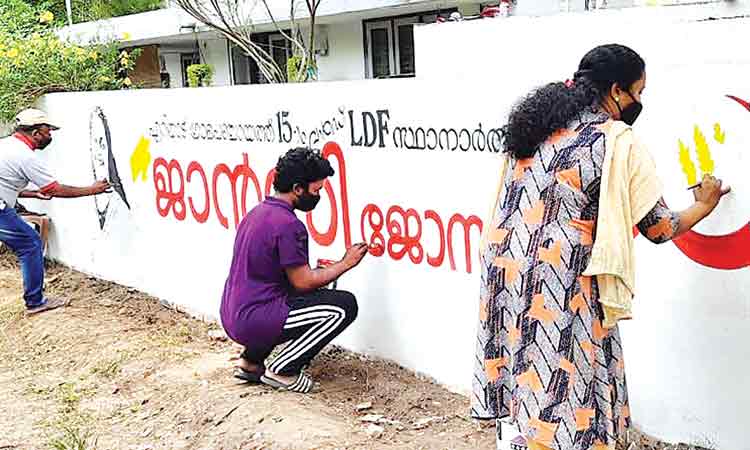 കൊടുങ്ങല്ലൂർ എറിയാട് പഞ്ചായത്തിലെ 15ാം വാർഡിൽ ഇടതുപക്ഷ സ്ഥാനാർഥിയാണ് ജാൻസി ജോസഫ്. തെരഞ്ഞെടുപ്പിന് ചൂട് പിടിച്ചപ്പോൾ ഹീര ജോസഫും ആവേശത്തോടെ നാട്ടിലെത്തി പ്രചാരണത്തിനിറങ്ങുകയായിരുന്നു. ചിത്രകലാ അധ്യാപിക കൂടിയായ സ്ഥാനാർഥിയും കലാകാരനായ മകൻ ഡോൺ ജോസഫും ചുമരെഴുത്തിന് ഒപ്പമുണ്ട്. ബഹ്റൈനിൽ അനിമേഷൻ രംഗത്ത് ജോലി ചെയ്യുന്ന മകൻ ഡിയോൺ ജോസഫും സാേങ്കതിക സഹായം നൽകുന്നുണ്ട്.