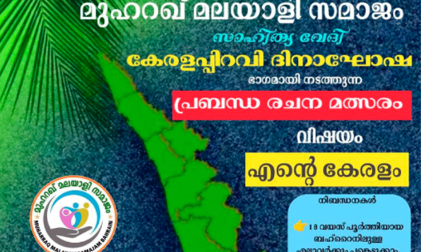 മനാമ: മുഹറഖ് മലയാളി സമാജം സാഹിത്യവേദി നേതൃത്വത്തിൽ കേരളപ്പിറവി ആഘോഷ ഭാഗമായി പ്രബന്ധ രചന മത്സരം നടത്തുന്നു.18 വയസ്സിനു മുകളിലുള്ളവർക്കാണ് പങ്കെടുക്കാൻ അവസരം. എന്റെ കേരളം എന്ന വിഷയത്തിൽ എ ഫോർ പേപ്പറിൽ രണ്ട് പേജ് കവിയാത്ത രീതിയിൽ പി.ഡി.എഫ് ആയി വേണം അയക്കാൻ.