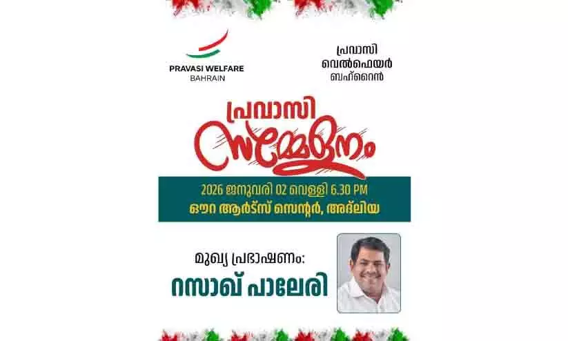 text_fieldsമനാമ: പ്രവാസി സമൂഹത്തിന്റെ ക്ഷേമവും സാഹോദര്യവും ലക്ഷ്യമാക്കി പ്രവർത്തിക്കുന്ന പ്രവാസി വെൽഫെയർ വാർഷിക പ്രവാസി സമ്മേളനവും പുതിയ നേതൃത്വ പ്രഖ്യാപനവും ഇന്ന് അദ് ലിയ ഔറ ആർട്സ് സെന്റർ ഓഡിറ്റോറിയത്തിൽ നടക്കും. വൈകീട്ട് ആറിന് നടക്കുന്ന സമ്മേളനത്തിൽ റസാഖ് പാലേരി മുഖ്യാതിഥിയായി പങ്കെടുക്കും. ബഹ്റൈനിലെ സാമൂഹിക, സാംസ്കാരിക, സേവന മേഖലകളിൽ പ്രവർത്തിക്കുന്ന പ്രമുഖ വ്യക്തിത്വങ്ങളും ഇതിൽ സന്നിഹിതരാകും.