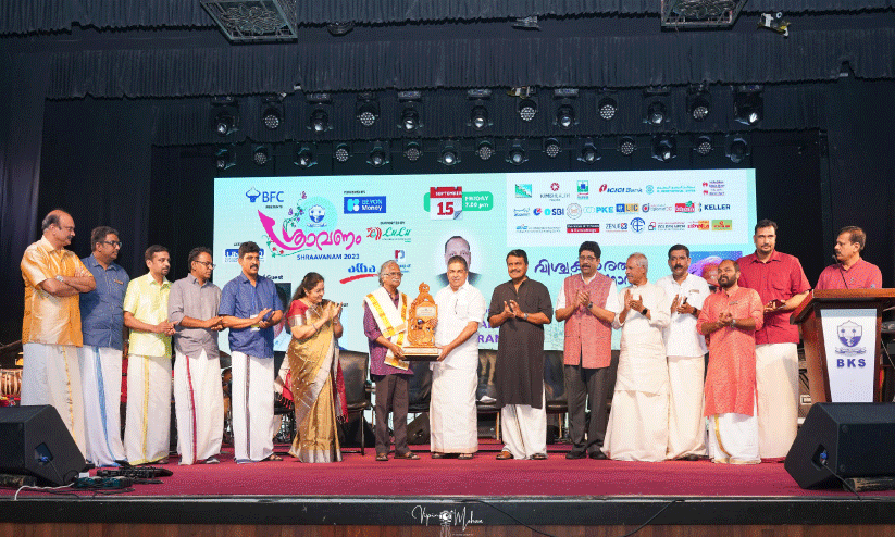 text_fieldsപ്രഥമ എം.പി രഘു സ്മാരക ബി.കെ.എസ്. വിശ്വകലാരതത്ന പുരസ്കാരം ഗാനരചയിതാവ് ശ്രീകുമാരൻ തമ്പിക്ക് കേരള സാംസ്കാരിക മന്ത്രി സജി ചെറിയാൻ സമ്മാനിക്കുന്നു
