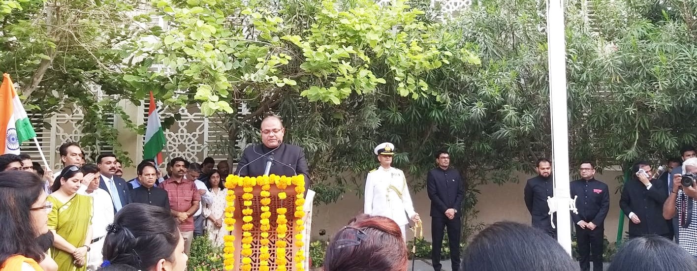 ഇന്ത്യൻ എംബസിയിൽ നടന്ന ചടങ്ങിൽ അംബാസഡർ പീയൂഷ് ശ്രീവാസ്തവ ദേശീയ പതാക ഉയർത്തി. മഹാത്മാഗാന്ധിയുടെ പ്രതിമയിൽ പുഷ്പാർച്ചന നടത്തിയ ശേഷമാണ് അംബാസഡർ പതാക ഉയർത്തൽ ചടങ്ങിനെത്തിയത്. തുടർന്ന് രാഷ്ട്രപതി ദ്രൗപദി മുർമുവിെന്റ സ്വാതന്ത്ര്യ ദിന സന്ദേശം അദ്ദേഹം വായിച്ചു. ഇന്ത്യക്കാർക്ക് മാത്രമല്ല, ലോകമെങ്ങുമുള്ള ജനാധിപത്യ സ്നേഹികൾക്ക് ആഹ്ലാദിക്കാനുള്ള മുഹൂർത്തമാണ് ഇതെന്ന് രാഷ്ട്രപതി സന്ദേശത്തിൽ പറഞ്ഞു. സ്വാതന്ത്ര്യം ലഭിച്ച നാളുകളിൽ ഇന്ത്യയിലെ ജനാധിപത്യ സർക്കാരിെന്റ വിജയത്തെക്കുറിച്ച് ലോകനേതാക്കൾ സന്ദേഹം പ്രകടിപ്പിച്ചിരുന്നു. എന്നാൽ, ജനാധിപത്യം ഇന്ത്യയിൽ വേരുറപ്പിക്കുക മാത്രമല്ല, വളർന്ന് പന്തലിക്കുകയും ചെയ്തുവെന്ന് അവർ വ്യക്തമാക്കി.