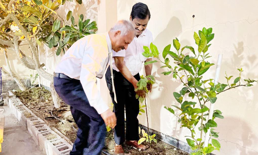 ബഹ്റൈൻ കേരളീയ സമാജം പ്രസിഡന്റ് പി.വി. രാധാകൃഷ്ണപിള്ളയും ജനറൽ സെക്രട്ടറി വർഗീസ് കാരക്കലും വൃക്ഷത്തൈകൾ നടുന്നു