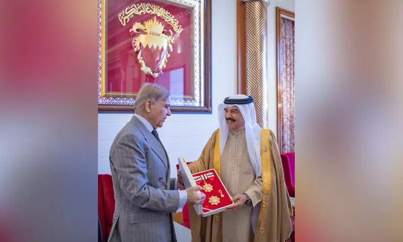 മനാമ: ഔദ്യോഗിക സന്ദർശനത്തിനായി ബഹ്റൈനിലെത്തിയ പാകിസ്താൻ പ്രധാനമന്ത്രി മുഹമ്മദ് ഷഹബാസ് ഷെരീഫിനെ ഓർഡർ ഓഫ് ബഹ്റൈൻ (വിസാം അൽ ബഹ്റൈൻ), ഫസ്റ്റ് ക്ലാസ് ബഹുമതി നൽകി ആദരിച്ച് രാജാവ് ഹമദ് ബിൻ ഈസ ആൽ ഖലീഫ.