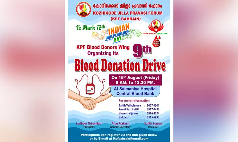 text_fieldsമനാമ: കോഴിക്കോട് ജില്ല പ്രവാസി ഫോറം (കെ.പി. എഫ് ബഹ്റൈൻ) 79ാമത് ഇന്ത്യൻ സ്വാതന്ത്ര്യ ദിനത്തിന്റെ ഭാഗമായി ഇന്ന് രാവിലെ എട്ടു മണി മുതൽ ഉച്ചക്ക് 12.30 വരെ സൽമാനിയ മെഡിക്കൽ കോപ്ലക്സിൽ രക്തദാന ക്യാമ്പ് സംഘടിപ്പിക്കുന്നു. ‘രക്തം നൽകൂ ജീവൻ നൽകൂ’ എന്ന സന്ദേശവുമായി മൂന്ന് മാസം കൂടുംതോറും നടത്തിവരുന്ന ക്യാമ്പിൽ രക്തം നൽകാൻ താൽപര്യമുള്ളവർ താഴെ കാണുന്ന നമ്പറിൽ ചാരിറ്റി വിങ് കൺവീനറെ സമീപിക്കാമെന്ന് പ്രസിഡന്റ് സുധീർ തിരുന്നിലത്ത്, ജനറൽ സെക്രട്ടറി അരുൺ പ്രകാശ്, ട്രഷറർ സുജിത്ത് സോമൻ എന്നിവർ വാർത്തക്കുറിപ്പിലൂടെ അറിയിച്ചു. സജിത്ത് വെള്ളികുളങ്ങര (ചാരിറ്റി വിങ് കൺവീനർ) 3627050.