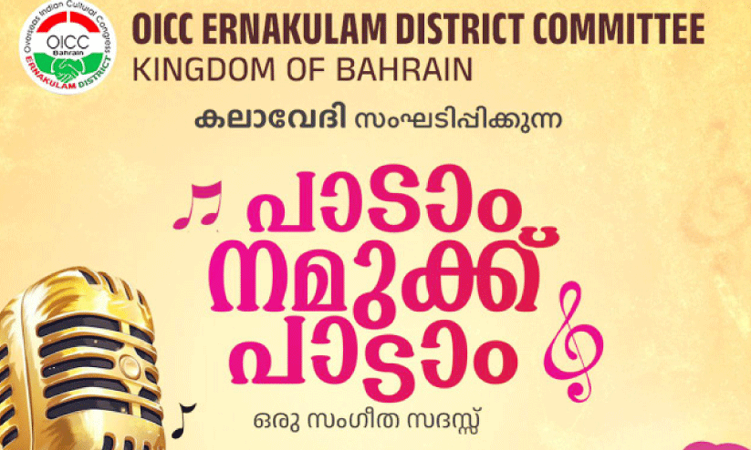 text_fieldsമനാമ: ഒ.ഐ.സി.സി എറണാകുളം ജില്ല കമ്മിറ്റിയുടെ കലാവേദി ‘പാടാം നമുക്ക് പാടാം’ സംഘടിപ്പിക്കുന്നു. ബഹ്റൈനിലെ അറിയപ്പെടുന്ന പാട്ടുകാർ എല്ലാം ഒന്നിച്ചു അണിനിരക്കുന്ന ഈ സംഗീത സദസ്സിൽ എല്ലാവർക്കും പാടാൻ അവസരം.