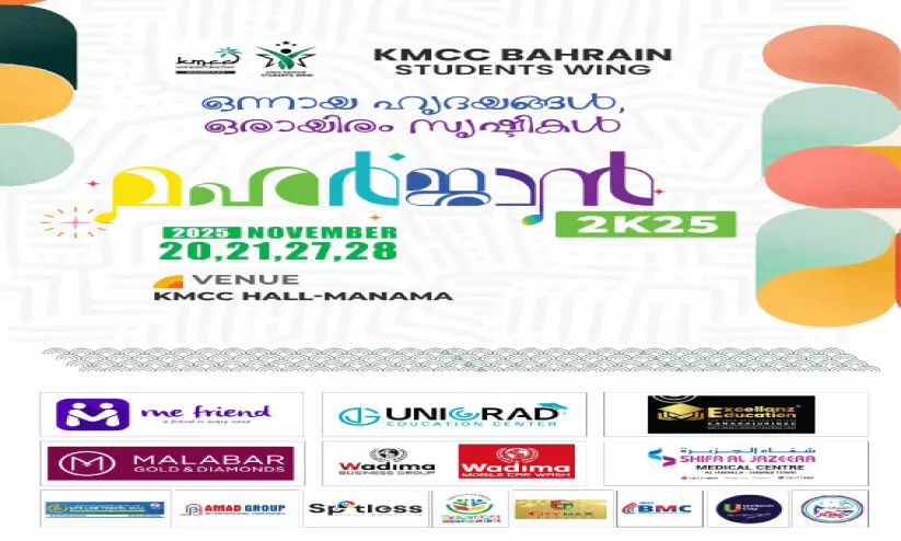 text_fieldsമനാമ: കെ.എം.സി.സി ബഹ്റൈൻ സ്റ്റുഡന്റ്സ് സംഘടിപ്പിച്ച് വരുന്ന മഹർജാൻ 2K25 കലോത്സവം വെള്ളിയാഴ്ച സമാപിക്കും. 76 ഇനങ്ങളിലായി 550ൽപരം വിദ്യാർഥികളാണ് കലോത്സവത്തിൽ പങ്കെടുക്കുന്നത്. 106 പോയന്റുമായി കോഴിക്കോട് ജില്ലയാണ് മുന്നിൽ. തൊട്ട് പുറകെ മലപ്പുറം ജില്ല കമ്മിറ്റി 102 പോയിന്റുമായും കാസർകോട് ജില്ല കമ്മിറ്റി 82 പോയന്റുമായും മികച്ച പോരാട്ടം കാഴ്ചവെക്കുന്നുണ്ട്.