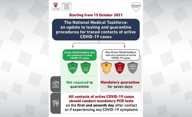 date_range 14 Oct 2021 5:33 PM ISTബഹ്റൈനിൽ ഗ്രീൻ ഷീൽഡുള്ളവർ കോവിഡ് രോഗികളുമായി സമ്പർക്കത്തിൽ വന്നാൽ ഹോം ക്വാറന്റീൻ വേണ്ട